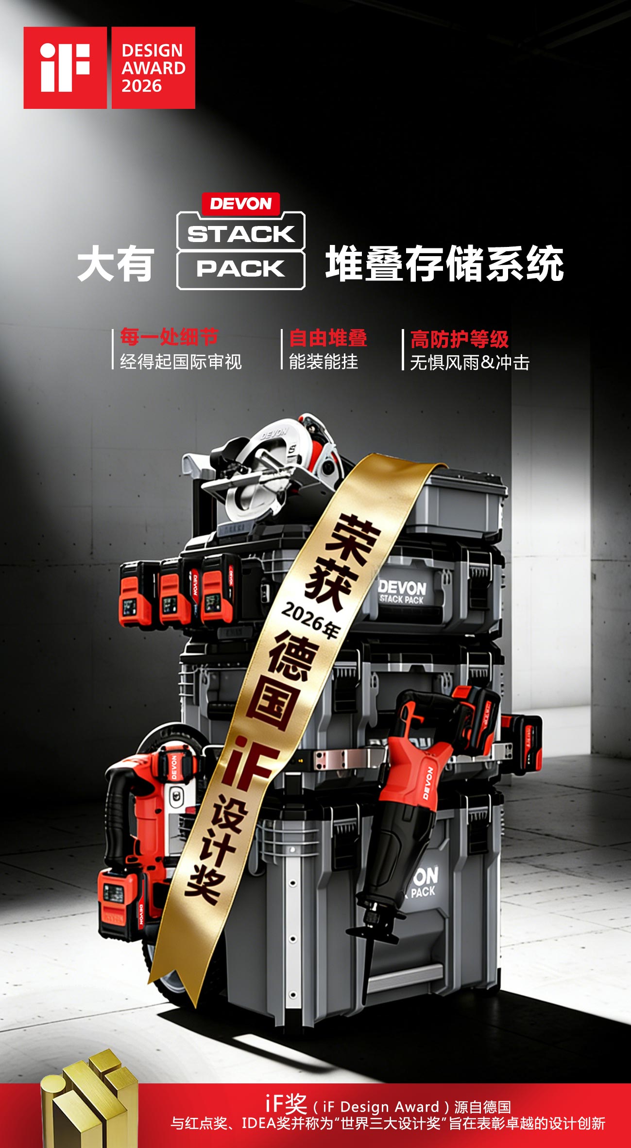Recently, the winners of the 2026 German iF Design Award, one of the world's top design competitions, have been officially announced. DEVON, the professional power tool brand under Chervon Holdings, stood out from nearly 10,000 entries from 68 countries and regions around the world with its STACKPACK 3-in-1 stackable toolbox and won the iF Design Award.