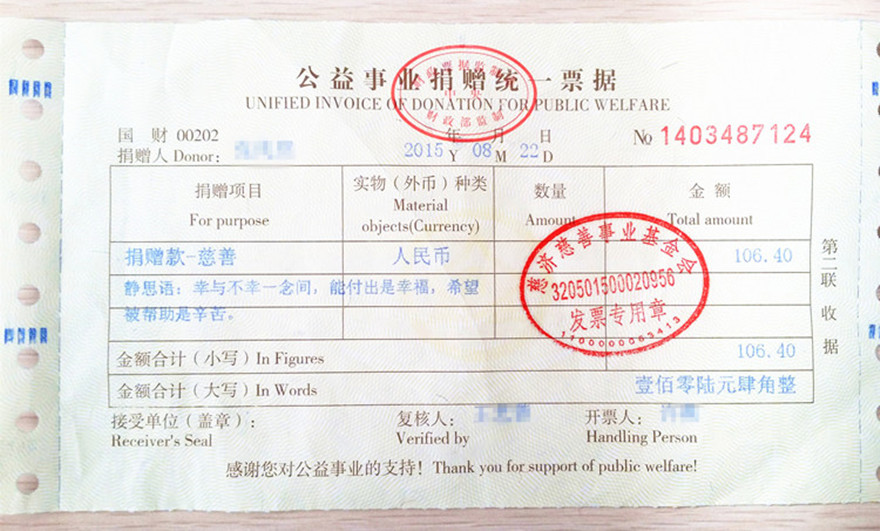 这是一张有着特别意义的爱心发票,捐赠人是一位泉峰同事四岁的女儿。儿童节前夕,我们曾经为泉峰小朋友准备了特别的节日礼物——爱心竹筒。新闻发布后,短短一个上午40个竹筒即被申领一空。